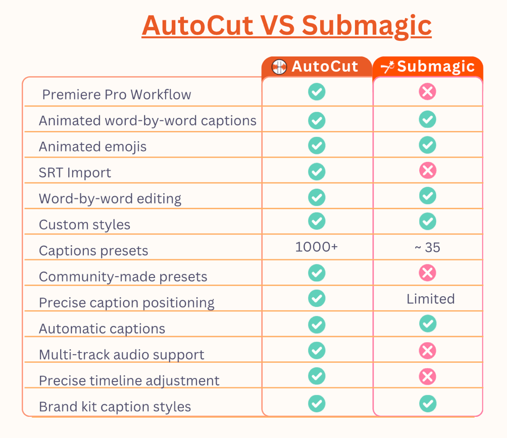 Submagic → is optimized for quickly producing ready-to-post Shorts AutoCut → is optimized for integrating animated captions into a complete Premiere Pro workflow with advanced control over timing, style, and positioning